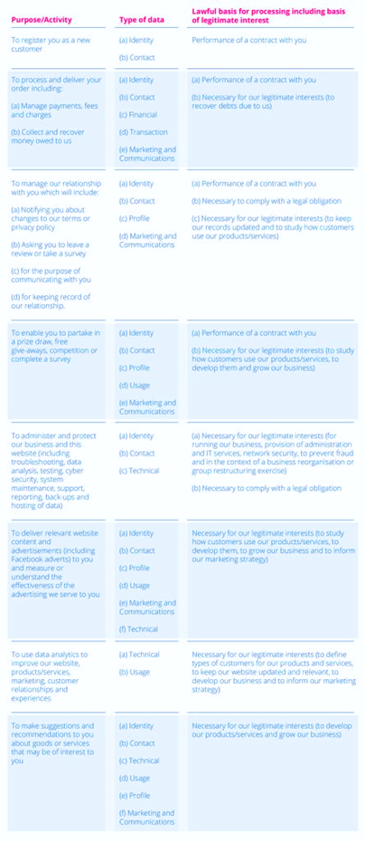 Note that we may process your personal data for more than one lawful ground depending on the specific purpose for which we are using your data. Please contact us if you need details about the specific legal ground, we are relying on to process your personal data where more than one ground has been set out in the table below.